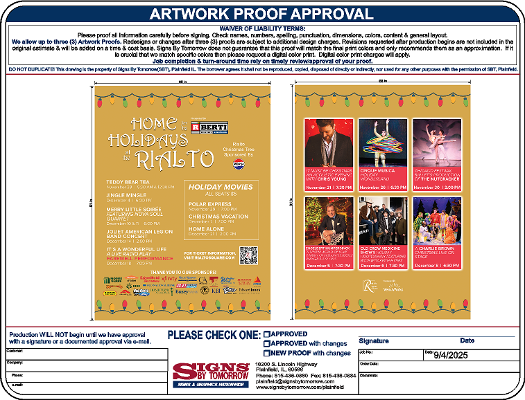 To design large-format window graphics to promote the annual "Home for the Holidays at the Rialto" event series, including a diverse calendar of live shows, holiday movies, and special teas.