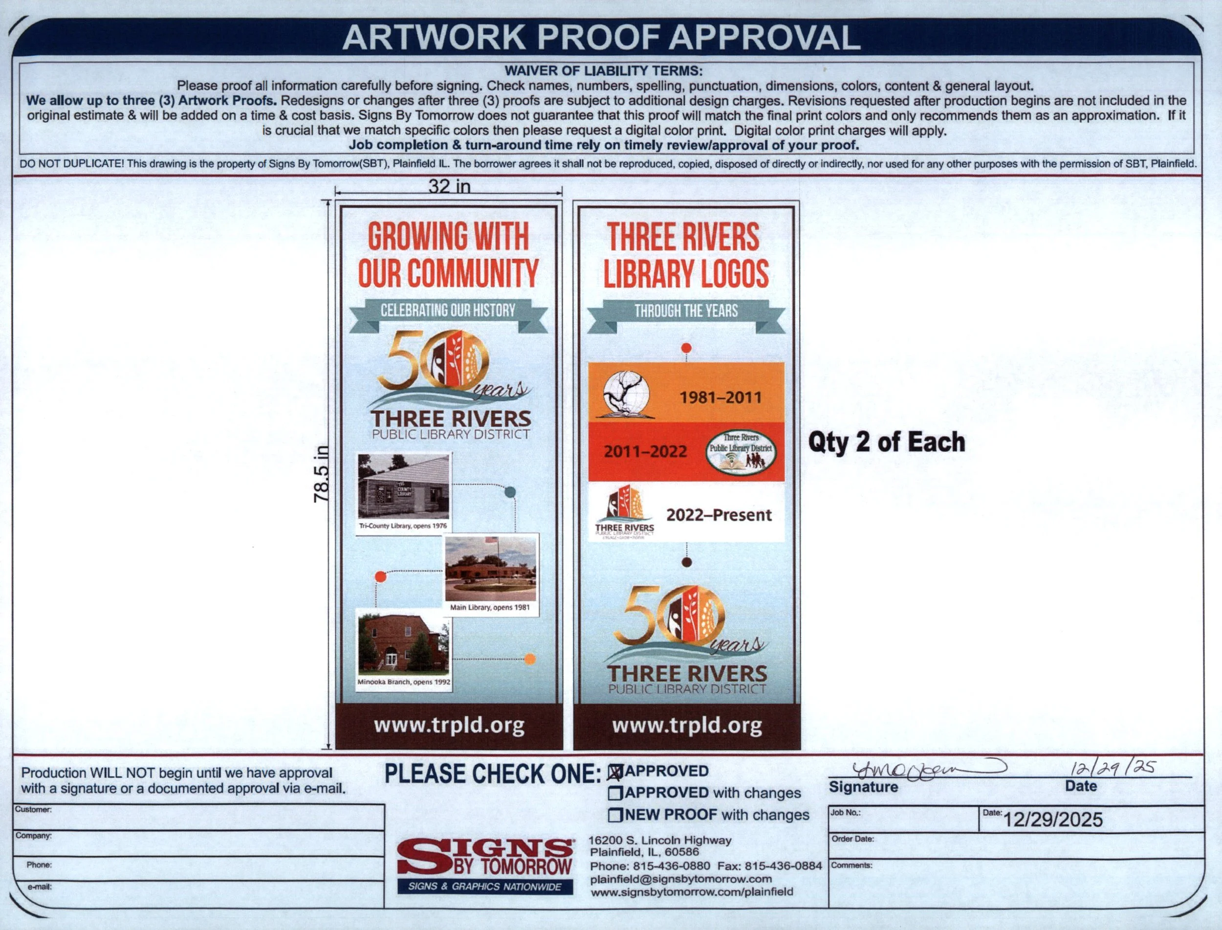 To design and produce a pair of cohesive, large-format retractable banners for the library’s 50th-anniversary celebration. The goal was to visualize the district’s growth and branding evolution, making the library’s history accessible and engaging for patrons while reinforcing its modern identity.